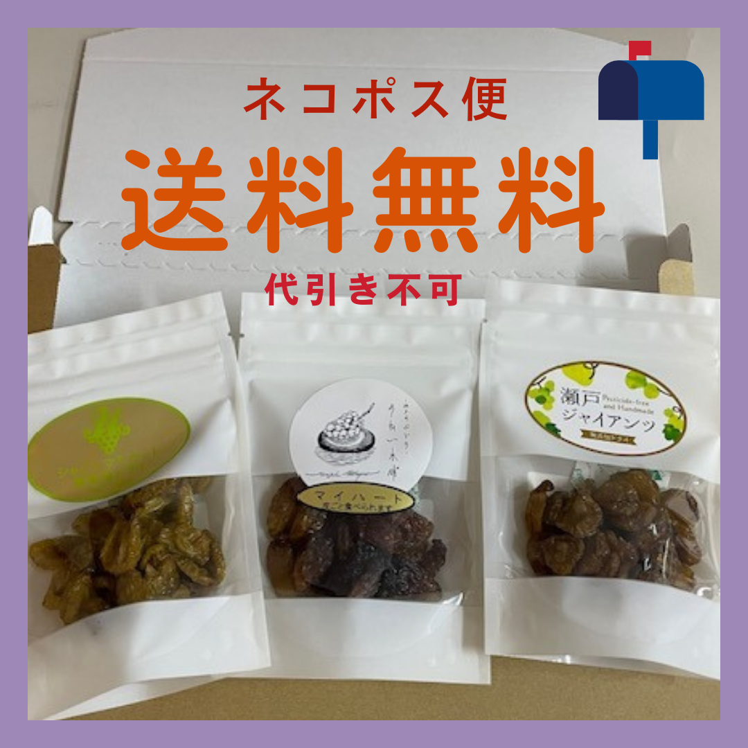 - シャインマスカット・瀬戸ジャイアンツ・マイハートの3種類入り、それぞれのぶどうの味わいとおいしさが楽します!!